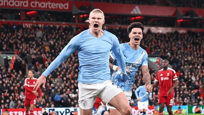 ম্যানচেস্টার সিটি অ্যানফিল্ডে লিভারপুলকে ২-১ গোলে পরাজিত করার জন্য একটি নাটকীয় স্টপেজ-টাইম বিজয়ী করে, রেডসের আট গেমের অপরাজিত হোম রানের সমাপ্তি ঘটায় এবং প্রিমিয়ার লিগের শিরোপা দৌড়কে দৃঢ়ভাবে বাঁচিয়ে রাখে।
